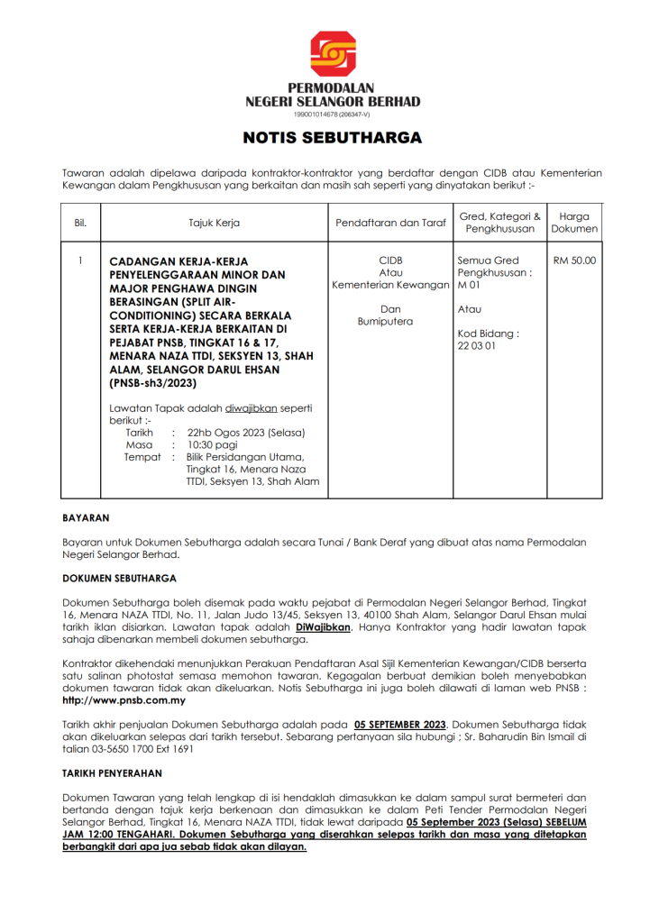Cadangan Kerja-Kerja Penyelenggaraan Minor Dan Major Penghawa Dingin Berasingan (Split Air-Conditioning) Secara Berkala Serta Kerja-Kerja Berkaitan Di Pejabat PNSB, Tingkat 16 & 17, Menara Naza TTDI, Seksyen 13, Shah Alam, Selangor Darul Ehsan (PNSB-SH3/2023)