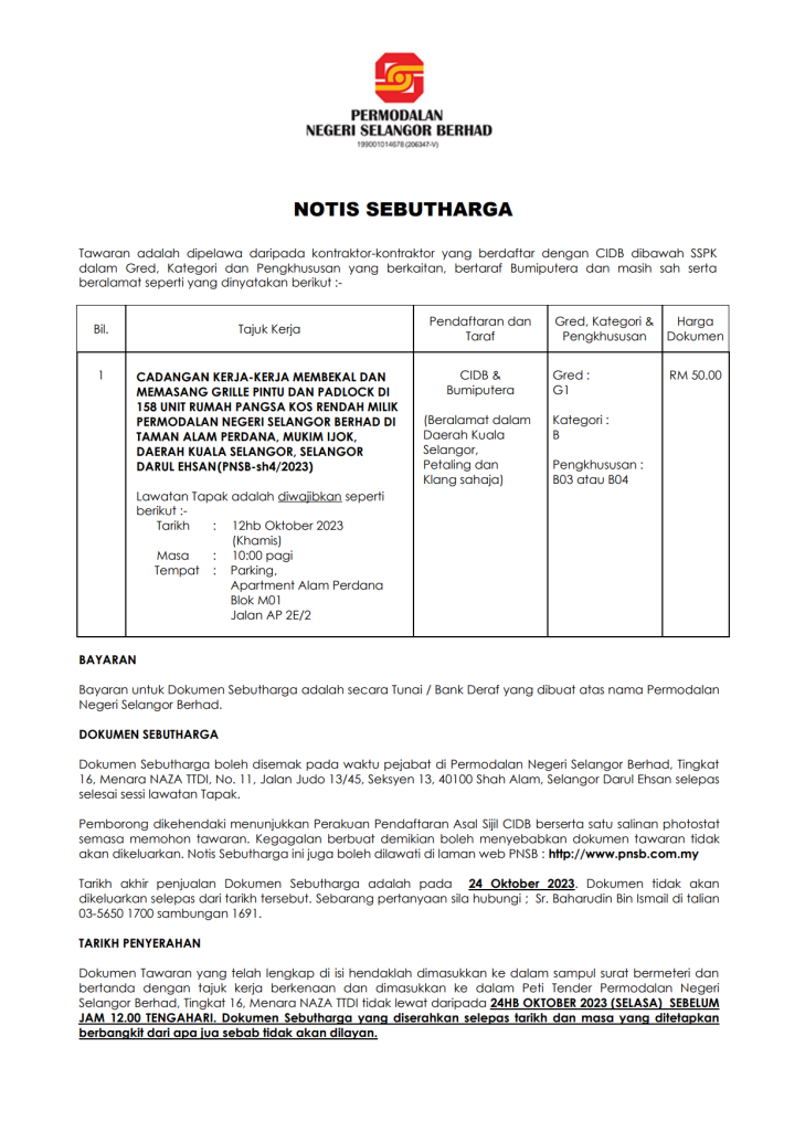 Cadangan Kerja-Kerja Membekal Dan Memasang Grille Pintu Dan Padlock Di 158 Unit Rumah Pangsa Kos Rendah Milik Permodalan Negeri Selangor Berhad Di Taman Alam Perdana, Mukim Ijok, Daerah Kuala Selangor, Selangor Darul Ehsan (PNSB-SH4/2023)