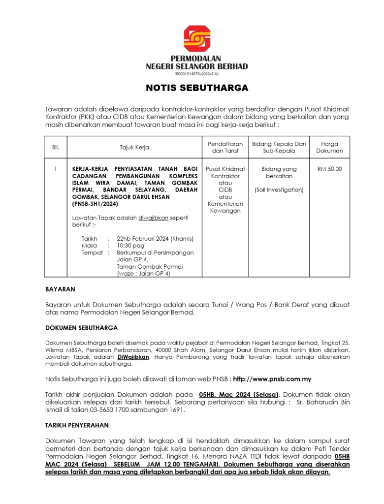 Kerja-Kerja Penyiasatan Tanah Bagi Cadangan Pembangunan Kompleks Islam Wira Damai, Taman Gombak Permai, Bandar Selayang, Daerah Gombak, Selangor Darul Ehsan (PNSB-SH1/2024)