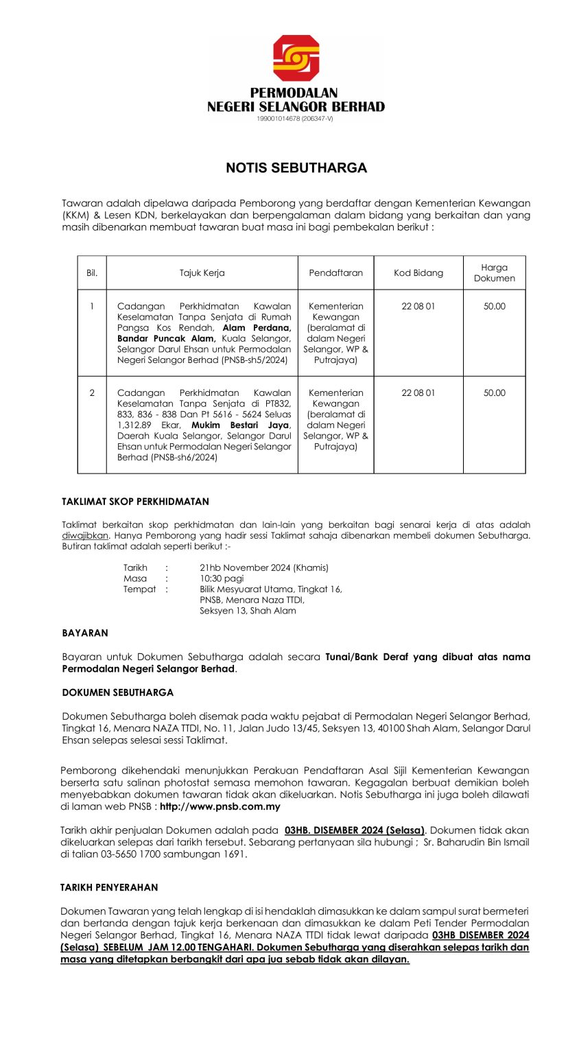 Cadangan Pembinaan Pagar, Papan Tanda Dan Penghadang Laluan Sementara Serta Kerja-Kerja Penebangan Pokok Dan Pembersihan Kawasan Di Atas Tanah Milik Permodalan Negeri Selangor Berhad (PNSB) Di Lot 84852, Mukim Sungai Buloh, Daerah Petaling, Selangor Darul Ehsan No. SH : PNSB-sh1/2025Tender / IklanMei 30, 2025Read article