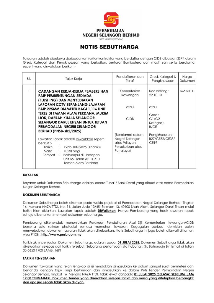 Cadangan Kerja-Kerja Pembersihan Paip Pembentungan Sediada (Flushing) Dan Menyediakan Laporan CCTV Sepanjang Jajaran Paip 225mm Diameter Bagi 1,116 Unit Teres Di Taman Alam Perdana, Mukim Ijok, Daerah Kuala Selangor, Selangor Darul Ehsan Untuk Tetuan Permodalan Negeri Selangor Berhad No. SH : PNSB-sh2/2025