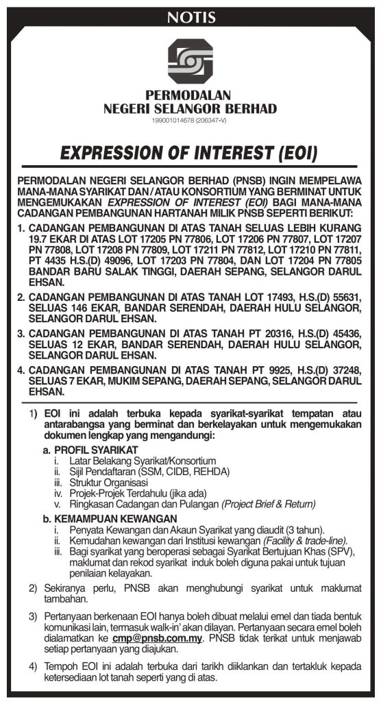 Notis ‘Expression Of Interest’ (EOI) – Permodalan Negeri Selangor Berhad (PNSB) Ingin Mempelawa Mana-Mana Syarikat Dan / Atau Konsortium Yang Berminat Untuk Mengemukakan ‘Expression Of Interest’ (EOI) Bagi Cadangan Pembangunan Hartanah Milik PNSB
