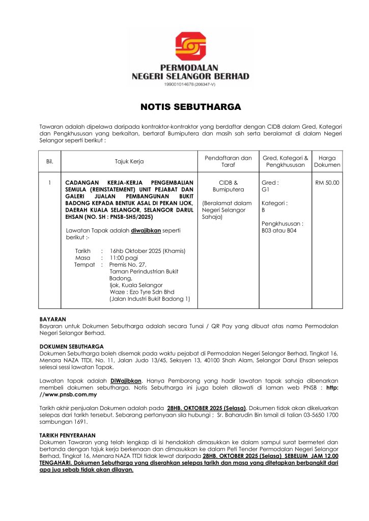 Cadangan Kerja-Kerja Pengembalian Semula (Reinstatement) Unit Pejabat Dan Galeri Jualan Pembangunan Bukit Badong Kepada Bentuk Asal Di Pekan Ijok, Daerah Kuala Selangor, Selangor Darul Ehsan (NO. SH : PNSB-SH5/2025)